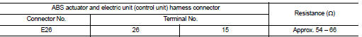 2. Check the resistance between the ABS actuator and electric unit (control unit) harness connector terminals.