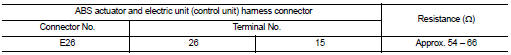 2. Check the resistance between the ABS actuator and electric unit (control unit) harness connector terminals.