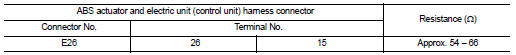 2. Check the resistance between the ABS actuator and electric unit (control unit) harness connector terminals.