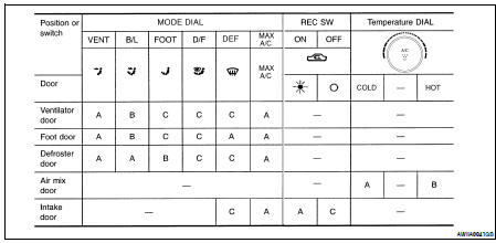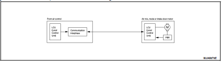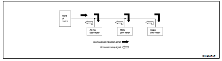 The mode door motor, air mix door motor and intake door motor read their respective signals according to the address signal. Opening angle indication signals received from the front air control and each of the motor position sensors is compared by the LCUs in each door motor with the existing decision and opening angles. Subsequently, HOT/COLD, DEF/VENT and FRE/REC operation is selected. The new selection data is returned to the front air control.