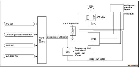 When A/C switch is pressed, or the defroster mode switch is pressed, the front air control outputs a compressor ON signal to the BCM.
