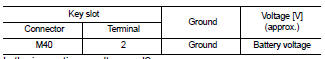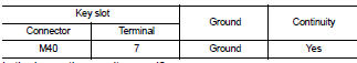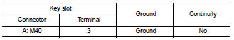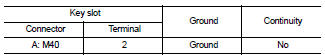 3. Check continuity between key slot harness connector M40 (A) terminal 2 and ground.