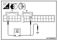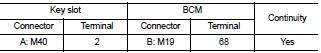 2. Check continuity between key slot harness connector M40 (A) terminal 2 and BCM harness connector M19 (B) terminal 68.