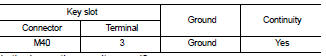 3. Check continuity between key slot harness connector M40 (A) terminal 3 and ground.