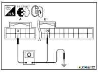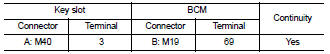2. Check continuity between key slot harness connector M40 (A) terminal 3 and BCM harness connector M19 (B) terminal 69.