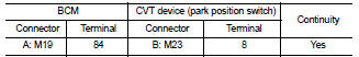 2. Check continuity between BCM harness connector M19 (A) terminal 84 and CVT device (park position switch) harness connector M23 (B) terminal 8.