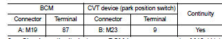 2. Check continuity between BCM harness connector M19 (A) terminal 87 and CVT device (park position switch) harness connector M23 (B) terminal 9.