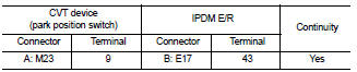 2. Check continuity between CVT device (park position switch) harness connector M23 (A) terminal 9 and IPDM E/R harness connector E17 (B) terminal 43.