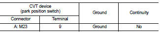 3. Check continuity between CVT device (park position switch) harness connector M23 (A) terminal 9 and ground.