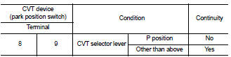 3. Check continuity between CVT device (park position switch) terminals as follows.