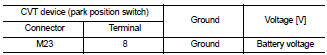 3. Check voltage between CVT device (park position switch) harness connector and ground.