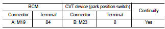 2. Check continuity between BCM harness connector M19 (A) terminal 84 and CVT device (park position switch) harness connector M23 (B) terminal 8.
