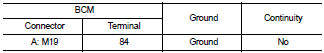 3. Check continuity between BCM harness connector M19 (A) terminal 84 and ground.