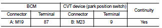 2. Check continuity between CVT device (park position switch) harness connector and BCM harness connector.