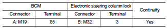 2. Check continuity between BCM harness connector M19 (A) terminal 85 and electronic steering column lock harness connector M32 (B) terminal 3.