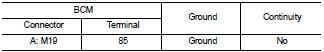 3. Check continuity between BCM harness connector M19 (A) terminal 85 and ground.
