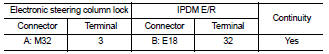 1. Check continuity between electronic steering column lock harness connector M32 (A) terminal 3 and IPDM E/R harness connector E18 (B) terminal 32.