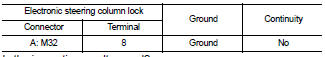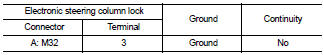 2. Check continuity between electronic steering column lock harness connector M32 (A) terminal 3 and ground.