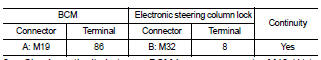 2. Check continuity between BCM harness connector M19 (A) terminal 86 and electronic steering column lock harness connector M32 (B) terminal 8.