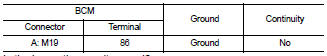 3. Check continuity between BCM harness connector M19 (A) terminal 86 and ground.
