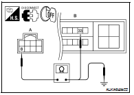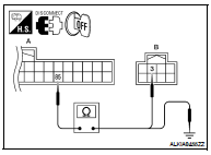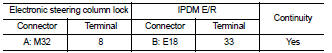 1. Check continuity between electronic steering column lock harness connector M32 (A) terminal 8 and IPDM E/R harness connector E18 (B) terminal 33.