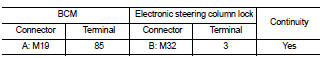 2. Check continuity between BCM harness connector M19 (A) terminal 85 and electronic steering column lock harness connector M32 (B) terminal 3.