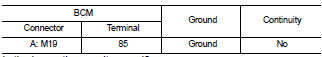 3. Check continuity between BCM harness connector M19 (A) terminal 85 and ground.