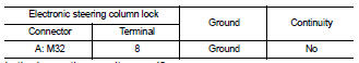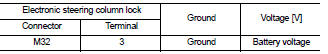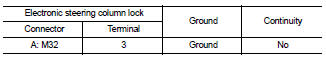 2. Check continuity between electronic steering column lock harness connector M32 (A) terminal 3 and ground.