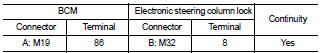 2. Check continuity between BCM harness connector M19 (A) terminal 86 and electronic steering column lock harness connector M32 (B) terminal 8.