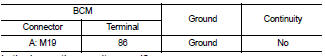 3. Check continuity between BCM harness connector M19 (A) terminal 86 and ground.