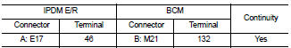 3. Check continuity between IPDM E/R harness connector and BCM harness connector.