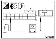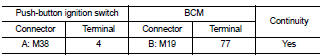 2. Check continuity between push-button ignition switch harness connector M38 (A) terminal 4 and BCM harness connector M19 (B) terminal 77.