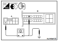 2. Check continuity between push-button ignition switch harness connector M38 (A) terminal 4 and IPDM E/R harness connector E18 (B) terminal 28.