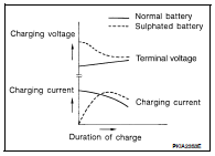 To determine if a battery has been “sulphated”, note its voltage and current when charging it. As shown in the figure, less current and higher voltage are observed in the initial stage of charging sulphated batteries.