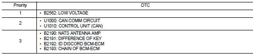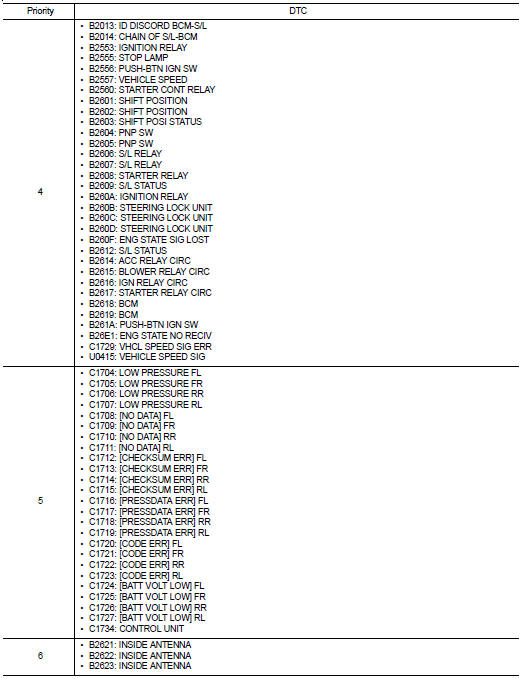 If some DTCs are displayed at the same time, perform inspections one by one based on the following priority chart.