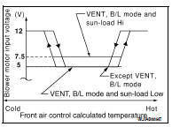 When the in-vehicle temperature and the set temperature are very close, the blower will be operating at low speed. The low speed will vary depending on the sunload. During conditions of low or no sunload, the blower speed is at duty ratio 25%. During high sunload conditions, the front air control. raise the blower speed (duty ratio 49%).