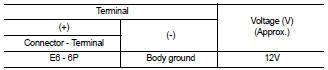 4. Check voltage between fuse block (J/B) E6 terminal 6P and ground.