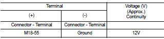 3. Check voltage between BCM harness connector M18 terminal 55 and ground.