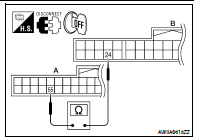 3. Check continuity between BCM harness connector M18 (A) terminal 55 and front air control harness connector M37 (B) terminal 24.