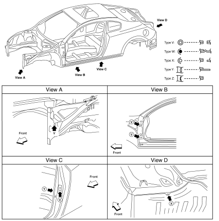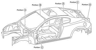 A mark has been placed on each body panel to indicate the parts matching positions. When repairing parts damaged by an accident which might affect the vehicle structure (members, pillars, etc.), more accurate and effective repair will be possible by using these marks together with body alignment specifications.