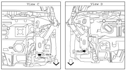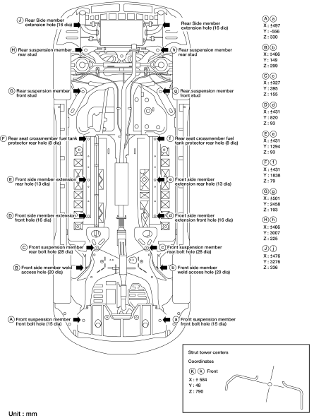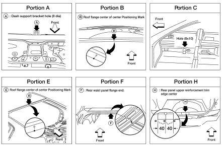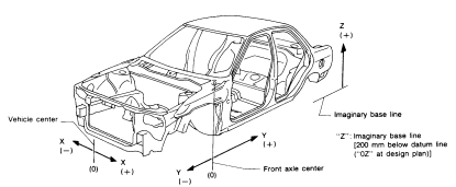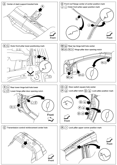 A mark has been placed on each part of the body to indicate the vehicle center. When repairing parts damaged by an accident which might affect the vehicle frame (members, pillars, etc.), more accurate and effective repair will be possible by using these marks together with body alignment specifications.