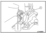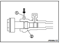 4. Bleed the air from the clutch system according to the following: 1. Push in the lock pin (1) of the bleeding connector (2), and hold it in.