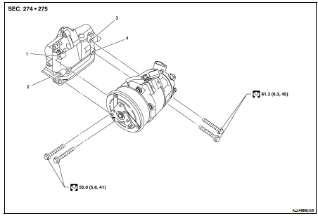 Installation is in the reverse order of removal. CAUTION: • For installation, tighten the compressor bolts in the order as shown.