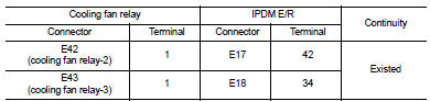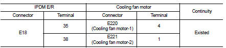 1. Check the continuity between IPDM E/R harness connector and cooling fan motor-1, -2 harness connector.