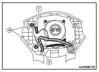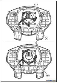 • Make sure that the steering switch harness is routed below the center of the air bag module inflator (1) as shown (B), and is not routed so it is pinched between the driver air bag module inflator (1) and steering column shaft threads as shown (A).