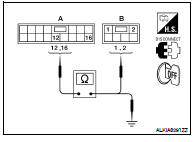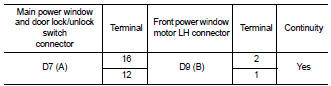 3. Check continuity between main power window and door lock/ unlock switch connector (A) and front power window motor LH connector (B).