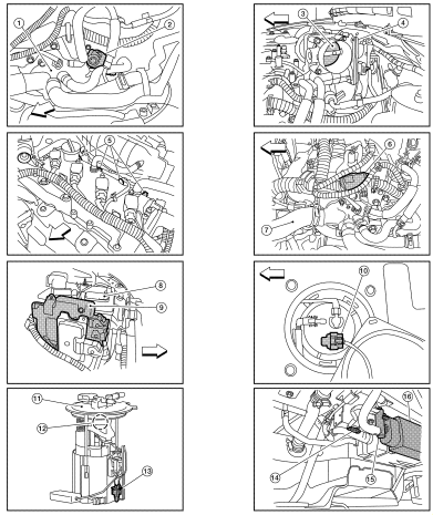 10. Fuel level sensor unit and fuel pump harness connector (This illustration is view with rear seat cushion and inspection hole cover removed.)