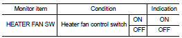 Select “HEATER FAN SW” and check indication under the following conditions.