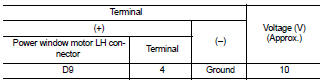 2. Check voltage between power window motor LH connector and ground.