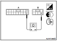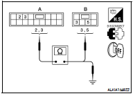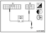3. Check continuity between main power window and door lock/ unlock switch connector (A) and power window motor connector (B).